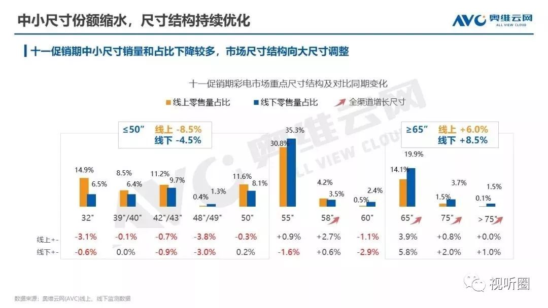 在剛剛過去的Q3中小尺寸彩電市場萎縮,50英寸成為傳統(tǒng)分界線:50寸以下線上與線下市場零售量占分別下滑5.5%和7.1%,尺寸價格上亦呈現(xiàn)連續(xù)下滑態(tài)勢。而50寸以上電視的需求,在不斷提升,尤其是在65寸及以上“大屏電視”則繼續(xù)“飆升”。其中65寸線上達(dá)到12.6%,線下達(dá)到15.8%,而另一個大屏電視主打尺寸75寸也在積極“上漲”,線上和線下占比差不多超過1%。