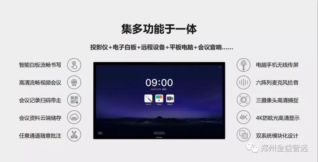 會議每時(shí)每刻都在發(fā)生,人們通過會議交流信息、達(dá)成共識、協(xié)同共創(chuàng)。會議是昂貴的商業(yè)行為,設(shè)備、人員、時(shí)間無一不是成本。在早期的會議室里,顯示昏暗的幕布,混亂不堪的線材,以及設(shè)備調(diào)試等待的時(shí)間,讓我們感到會議效率被大大降低了。我們設(shè)想,在企業(yè)會議室里,應(yīng)該有一面清晰的會議屏,在上面書寫沒有空間限制,設(shè)備可以無線連接,會議不再需要人工記錄,無論我們在哪里,都能和業(yè)務(wù)伙伴身臨其境地溝通。