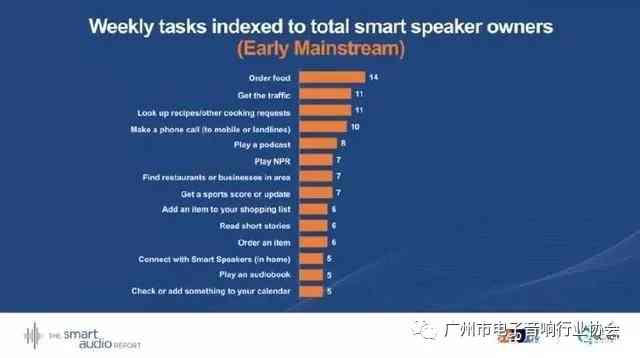 對于智能音箱的早期主流消費(fèi)者而言,使用智能音箱進(jìn)行操作的任務(wù)指令有以下這些(按使用頻率有高到低排列):訂餐,獲得交通資訊,查詢學(xué)習(xí)菜譜,收聽廣播電臺(tái),查詢附近的餐廳和商場,獲得體育賽事比分,聽短篇故事,訂購東西,用手機(jī)和智能音箱連接,聽有聲讀物,給你的日程表添加日程。