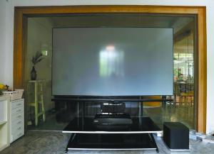 其搭配的一塊類似液晶顯示面板的超大顯示屏,叫做“玄烏冷屏”,100英寸的大小相當(dāng)于一臺55英寸液晶電視4倍左右的感覺,占據(jù)了墻面的大部分空間,因此,面積小的家庭恐怕有點hold不住。屏幕厚度僅10mm,整體由一塊軟屏和邊框、架子組成,高度超過1米,寬度超過2米,好像一個巨大的畫畫板。屏幕下方設(shè)有電視桌,可以放置投影儀等設(shè)備。
