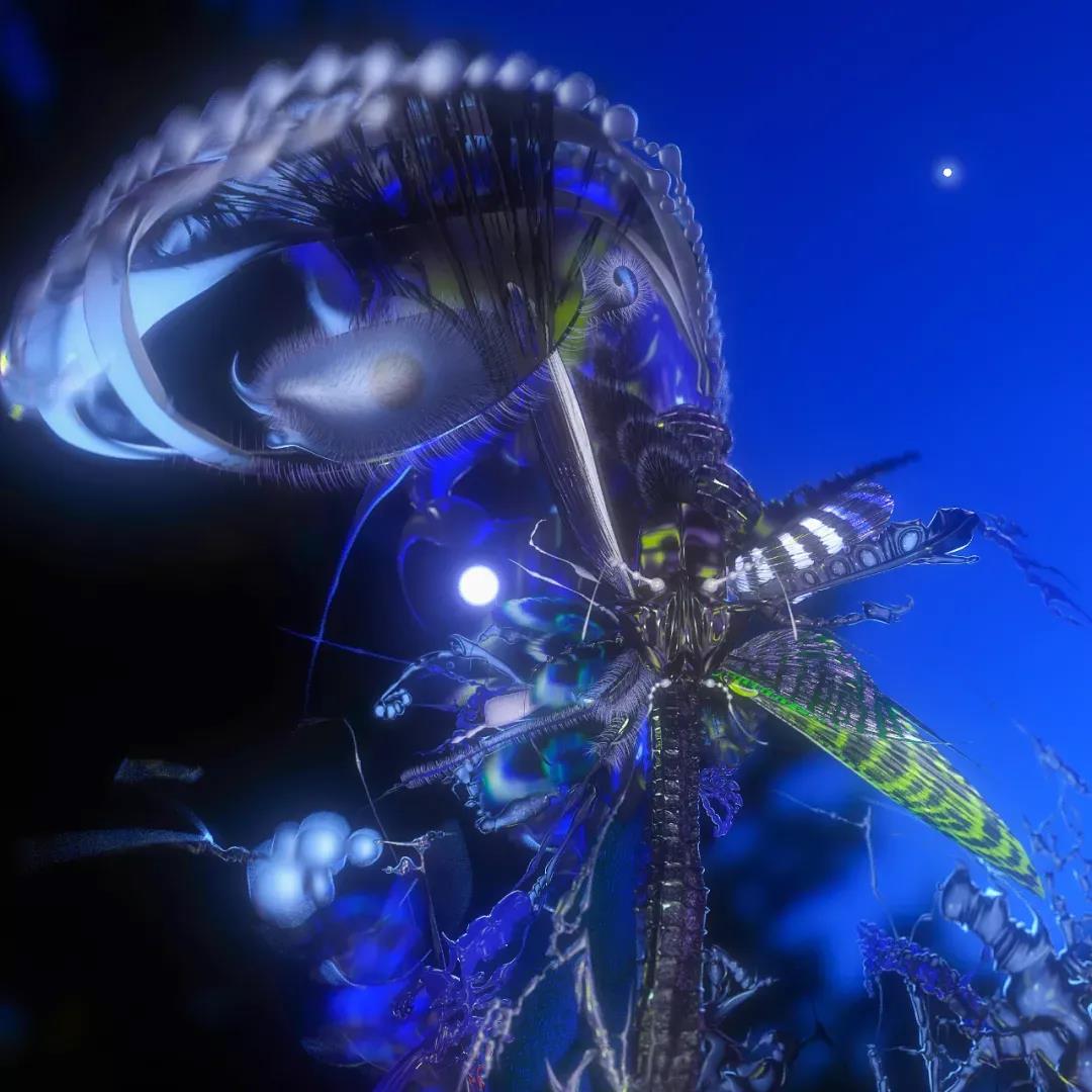 由于昆蟲是一種節(jié)肢動(dòng)物,在身體結(jié)構(gòu)上也是一種模塊化的結(jié)合方式,這個(gè)特點(diǎn)和機(jī)器很像。大悲宇宙覺得這可以很好的銜接機(jī)械設(shè)計(jì)的美學(xué)邏輯,在那個(gè)階段他嘗試了甲蟲、螳螂各種各樣的小昆蟲,最終發(fā)現(xiàn)蝴蝶具有非常好的承載能力,因?yàn)楹m然是一個(gè)三維生物但是是二維的呈現(xiàn),算法在蝴蝶上的呈現(xiàn)只需要將蝴蝶平鋪開來就可以顯示所有的信息,并且在一張圖片中就可以完成,而其他生物則需要三視圖來將所有信息鋪展出來,并且最重要的一點(diǎn),蝴蝶上所承載的紋理和造型不管是哪種形狀給人的感覺都不會(huì)有非常大的抵觸感,在表現(xiàn)力和算法的有效性上蝴蝶都存在極大的優(yōu)勢,最后大悲宇宙從最開始的奇奇怪怪的昆蟲落地到了蝴蝶上面。