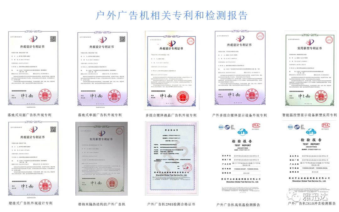 到目前,雅迅達連續(xù)九年榮獲“國家高新技術企業(yè)”,榮獲“連續(xù)7年守合同重信用企業(yè)”,累積注冊專利46件,軟件著作權19件,3C,F(xiàn)CC,CE,ROHS,節(jié)能證書,檢測報告等資質齊全。研發(fā)生產的公交站牌戶外廣告屏,戶外電子閱報欄,戶外廣告數字標牌等戶外產品廣泛應用在學校,高速公路,市政,景區(qū),小區(qū)等戶外場所。