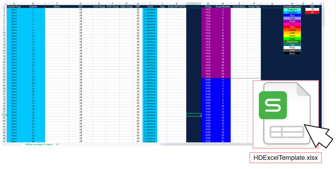 期間,還給老師們分享關(guān)于HD96-24調(diào)的電子表格導(dǎo)入功能。這是可以將此電子表格直接加載到調(diào)音臺(tái)的場景中,便捷地去建立活動(dòng)場景,方便我們能實(shí)現(xiàn)同步通道命名、顏色、設(shè)置VCA、設(shè)置POP、MUTE GROUP靜音編組和選擇AUX輔助類型等等,這些都能很好地讓老師們快速且便捷地完成現(xiàn)場調(diào)音工作。