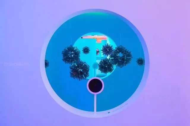 大圓鏡面將體驗者的彩色光影反射到墻面上。當(dāng)體驗者將自己置于光錐中時,便會在墻面上找到共鳴的引語。