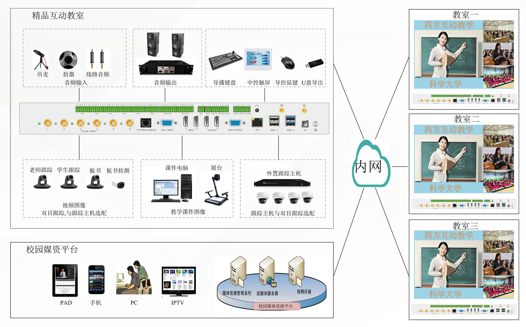 高清嵌入式一體化智能錄播系統(tǒng)包括了音視頻采集系統(tǒng)、自動(dòng)跟蹤系統(tǒng)、自動(dòng)導(dǎo)播系統(tǒng)、課程錄制系統(tǒng)、網(wǎng)絡(luò)直播系統(tǒng)等,各個(gè)子系統(tǒng)協(xié)同工作,實(shí)現(xiàn)課件錄制、直播、點(diǎn)播、攝像智能跟蹤定位、智能導(dǎo)播等功能模塊。一體化智能錄播系統(tǒng)支持多路高清視頻源同步錄制,同時(shí)可以通過(guò)網(wǎng)絡(luò)同步直播課件、提供學(xué)生課后學(xué)習(xí)、復(fù)習(xí),而且為后期老師聽(tīng)課評(píng)課,提供了很好的課件資源。另外,通過(guò)資源管理平臺(tái),可以很好的解決教學(xué)以及管理中的時(shí)間、空間、課件長(zhǎng)期安全保存以及網(wǎng)上點(diǎn)播、重復(fù)利用等實(shí)際問(wèn)題。