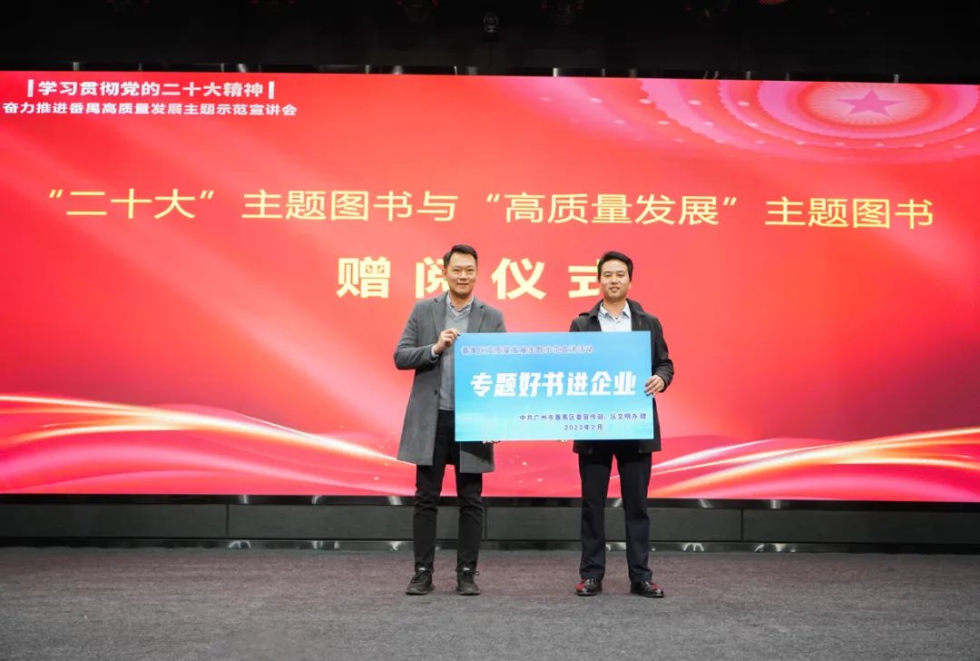 市委講師團(tuán)副團(tuán)長區(qū)肇君向保倫電子贈與主題圖書