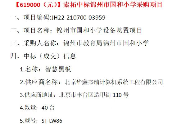 【619000(元)】索拓中標錦州市國和小學采購項目