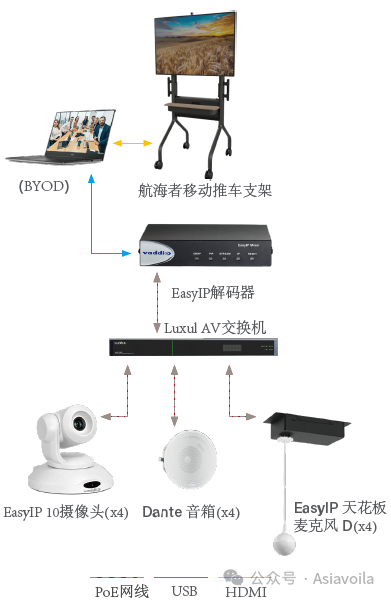 4)音視頻設備僅需網(wǎng)線即可完成信號傳輸、控制命令、電源供電。