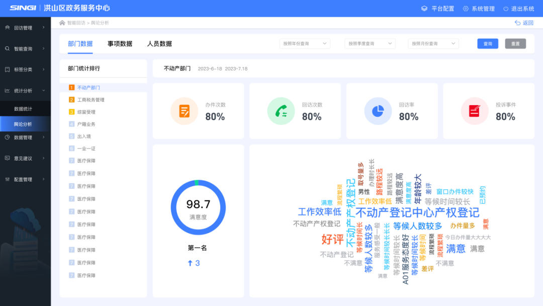 對(duì)回訪(fǎng)的數(shù)據(jù)進(jìn)行統(tǒng)一的匯總與查詢(xún),支持按照事項(xiàng)、人員、服務(wù)窗口、部門(mén)、標(biāo)簽等數(shù)十項(xiàng)查詢(xún)條件進(jìn)行細(xì)致的數(shù)據(jù)查詢(xún)于詳情展示,系統(tǒng)同時(shí)提供結(jié)果數(shù)據(jù)導(dǎo)出服務(wù)。