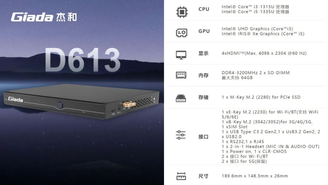 杰和科技D613采用Intel®第13代AlderLake處理器i3-1315U、i5-1335,比第11代性能提高19%,Intel® IRIS® Xe GPU (Core i5),圖形性能較上一代提升50%。支持4 x HDMI 2.0接口,提供多達(dá)4屏4K顯示(4096 x 2304@60Hz);支持1 x RJ45千兆網(wǎng)口,1 x E-Key M.2 (2230) for Wi-Fi/BT, 支持Wi-Fi 5, Wi-Fi 6, Wi-Fi 6E (CNVi),具備強(qiáng)大的網(wǎng)絡(luò)通信能力。支持1 x USB Type-C3.1,1 x USB3.1 2 x USB2.0,1 x RS232,1 x二合一音頻接口,拓展能力豐富,可以連接會(huì)議大屏、攝像頭、麥克風(fēng)、音響、U盤、擴(kuò)展塢、無線投屏等設(shè)備。