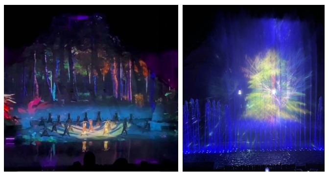 演出現(xiàn)場,演員與山體上的宏大投影(左側(cè))以及水幕上的投影(右側(cè))交相輝映,令觀眾如癡如醉