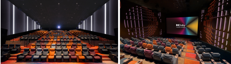 臺(tái)北巨蛋秀泰影城配備 12 塊由科視 Christie RGB 純激光放映機(jī)驅(qū)動(dòng)的銀幕,帶來(lái)震撼的觀影體驗(yàn)(左圖);此外,該影城還設(shè)有杜比視界 + 全景聲影廳,為觀眾打造沉浸式視聽(tīng)盛宴(右圖)